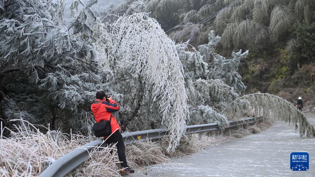 1月21日,一名摄影师在三江侗族自治县大塘坳水库附近拍摄冰凌。