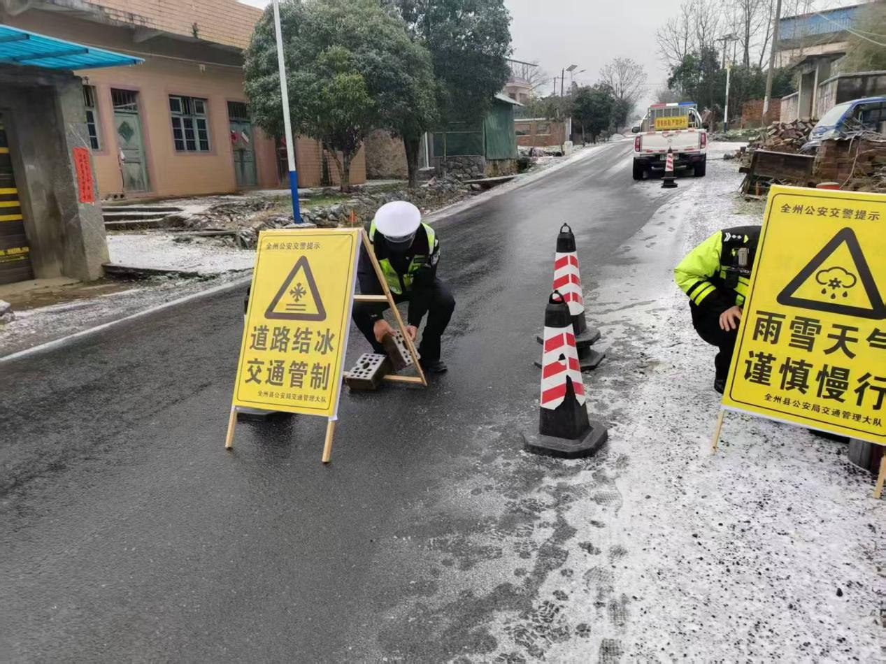 1月21日,全州县公安局交管大队民警在结冰路段设置警示牌。(桂林市公安局供图)