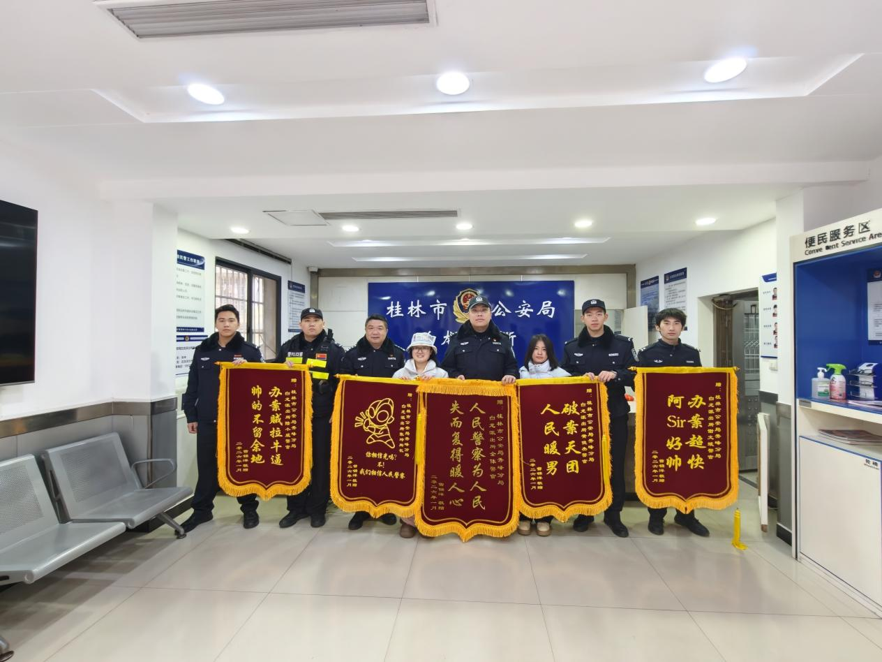 近日,桂林市公安局白龙派出所大厅内,大学生小曾送来的五面锦旗格外“亮眼”——上面写满了年轻人真诚又活泼的赞美:“办案超快 阿Sir好帅”“破案天团 人民暖男”……这些带着“网感”的话语,让所里民警津津乐道,也揭开了一桩关于“找回”的温暖小事。