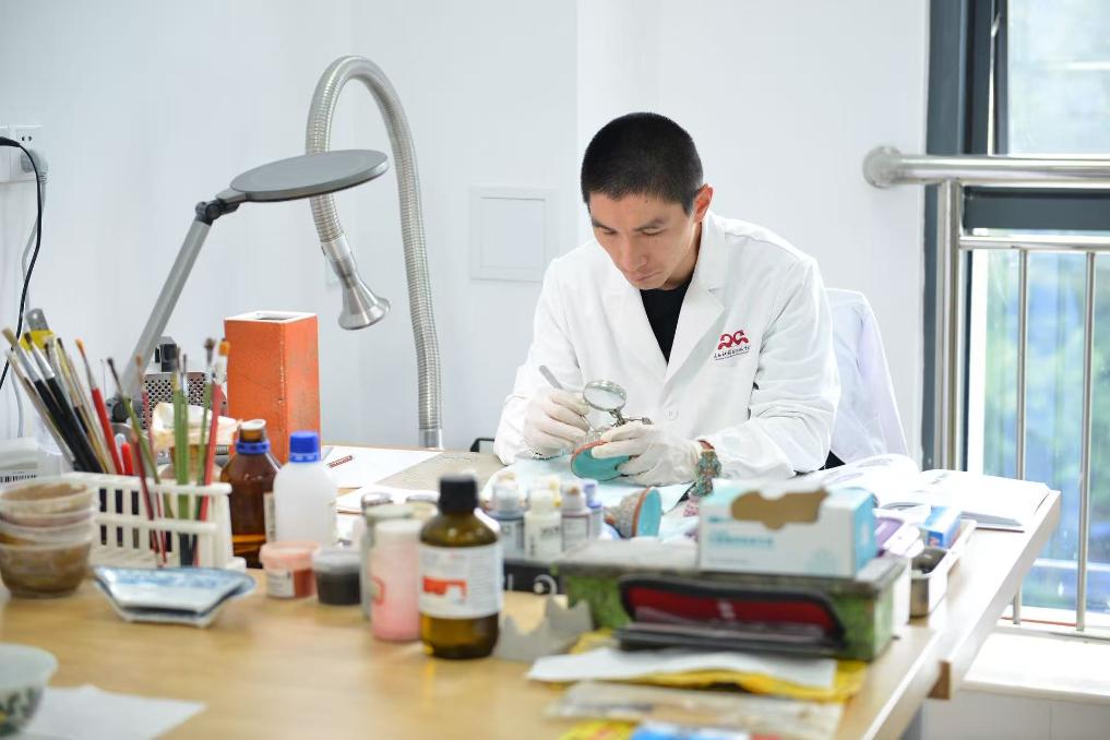 在所有展区中,让观众驻足时间最长的,当属两间被透明玻璃窗“框”进展厅的文物保护修复实验室。窗外,观众流连驻足;窗里,修复师手持排笔细细抚平古籍褶皱,或对瓷器釉面进行细致清理。文物修复最为日常的“慢时光”,如现场直播一般呈现在观众眼前。