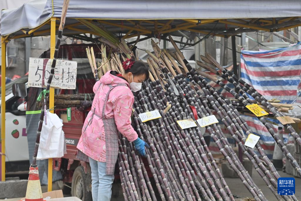 在柳州市柳江区进德镇集市,一名妇女在摆摊销售甘蔗(1月29日摄)。