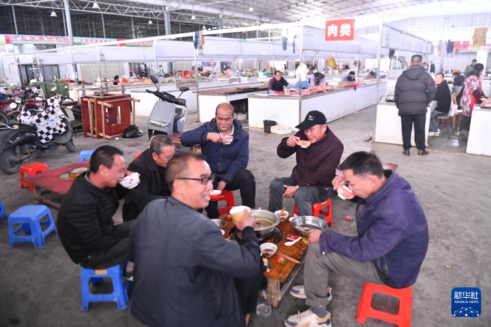 人们在柳州市柳江区成团镇集市吃早餐(1月28日摄)。