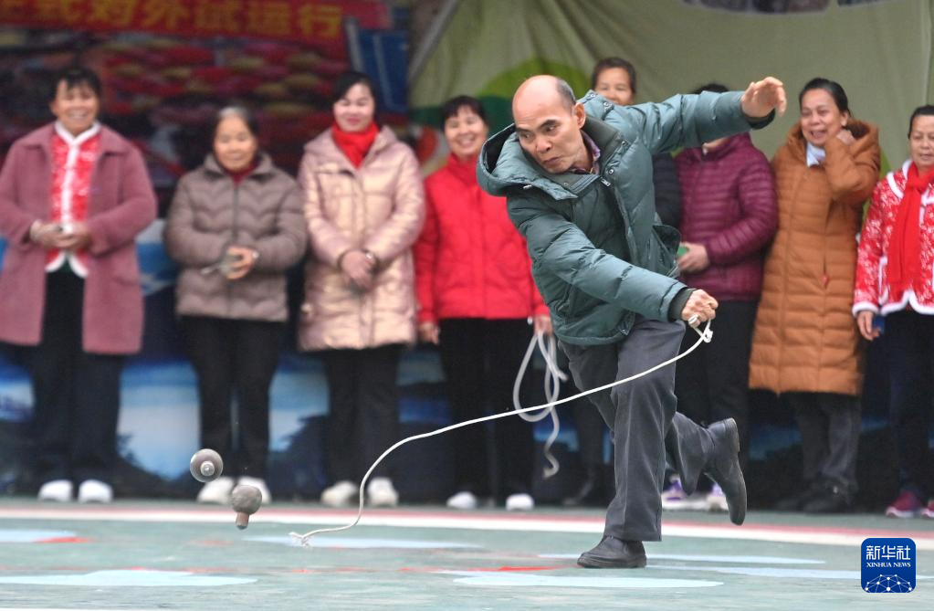 2月17日,广西河池市大化瑶族自治县大化镇仁良村举办迎新春陀螺比赛,欢度新春。