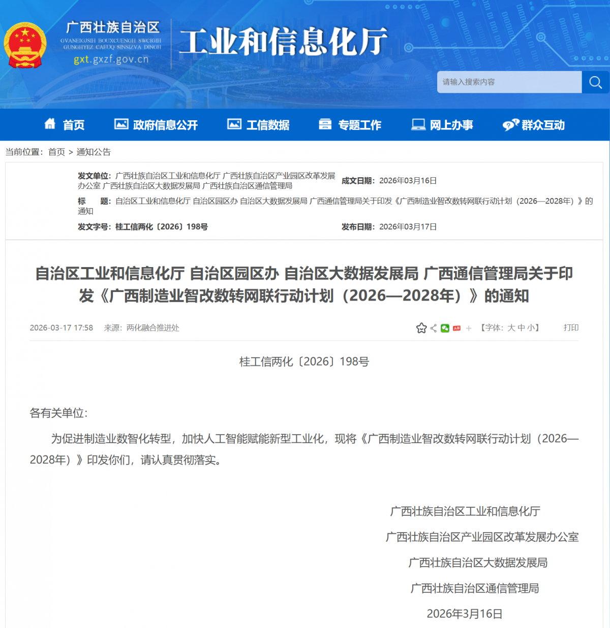 自治区工业和信息化厅 自治区园区办 自治区大数据发展局 广西通信管理局关于印发《广西制造业智改数转网联行动计划(2026—2028年)》的通知