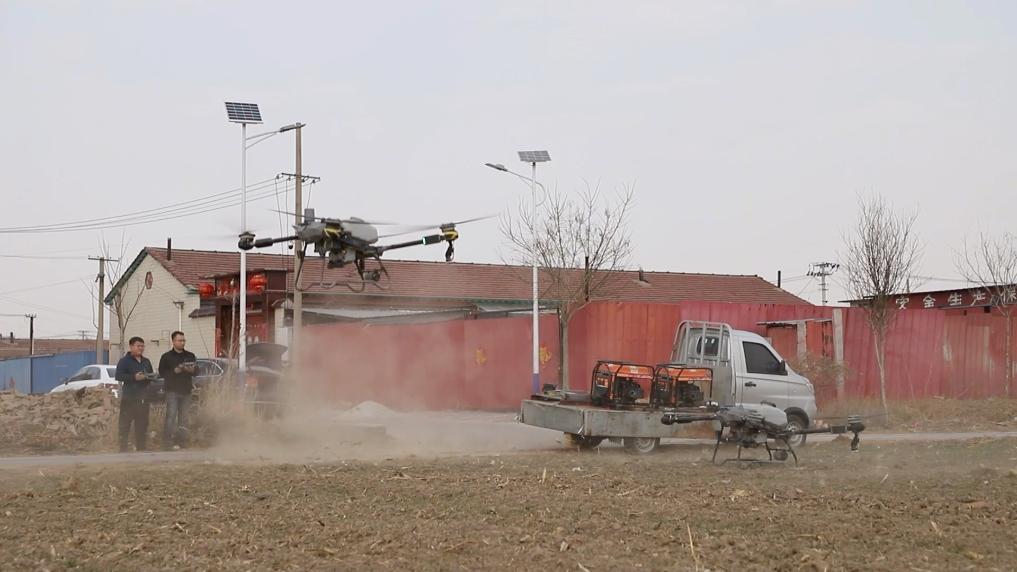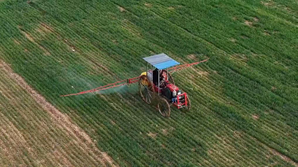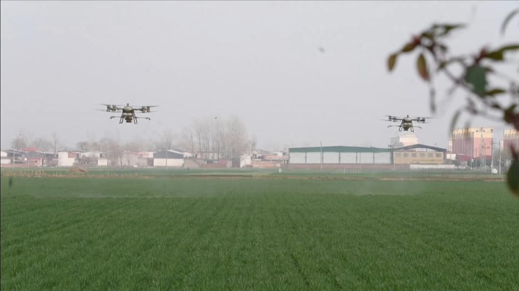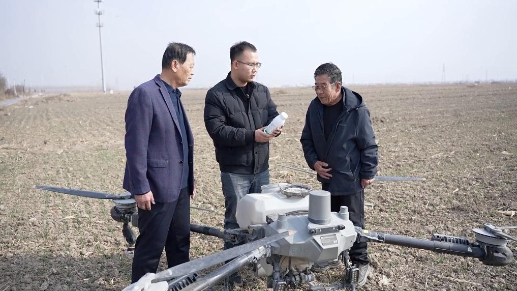 河北省沧州市孟村回族自治县的麦田里一片忙碌,大学毕业后返乡创业的“95后”新农人耿立宫,正带领着他的团队忙着追肥飞防作业。