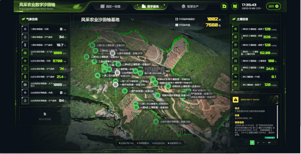 在容县县底镇旺黎村数字智能柚场,全自动水肥一体化系统正高效运行,施肥、补水、喷药等作业可一键完成。柚场中控室的AI智能管理系统大屏上,1000多亩柚树的土壤墒情、水肥数据实时更新,为精准管护提供科学依据。