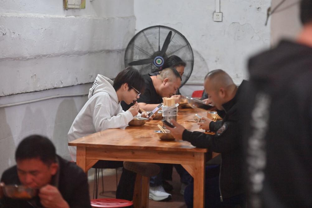 市民和游客在柳州市青云民生市场一家滤粉店吃滤粉(3月14日摄)。