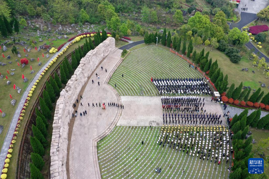4月2日,在广西全州县红军长征湘江战役纪念园凭吊广场,人们在祭奠红军英烈(无人机照片)。
