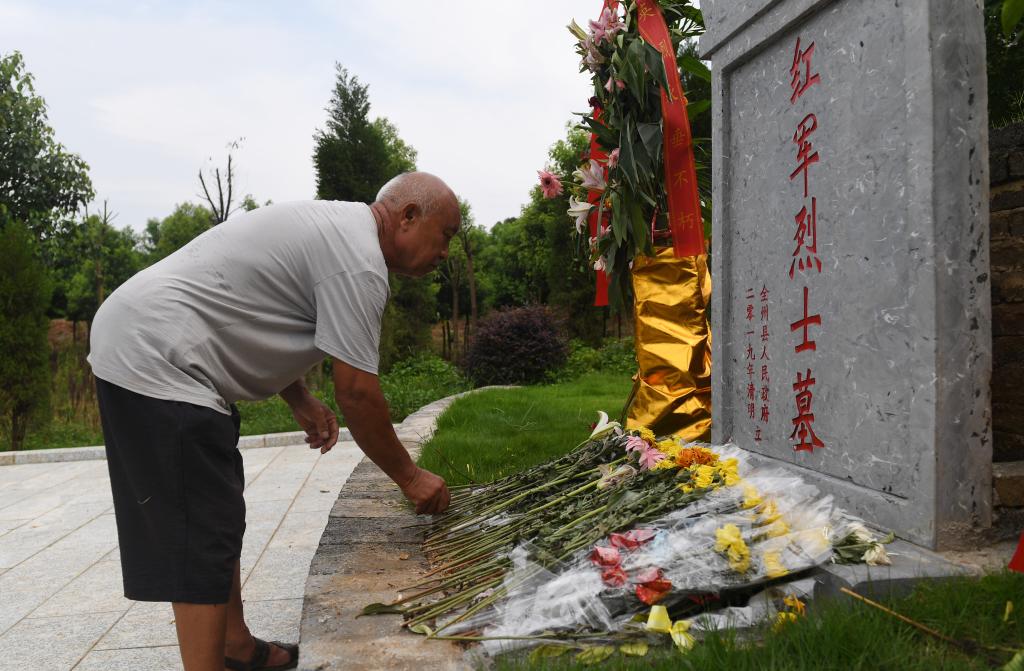 蒋石林在米花山红军烈士墓整理祭奠烈士的鲜花(2019年6月29日摄)。