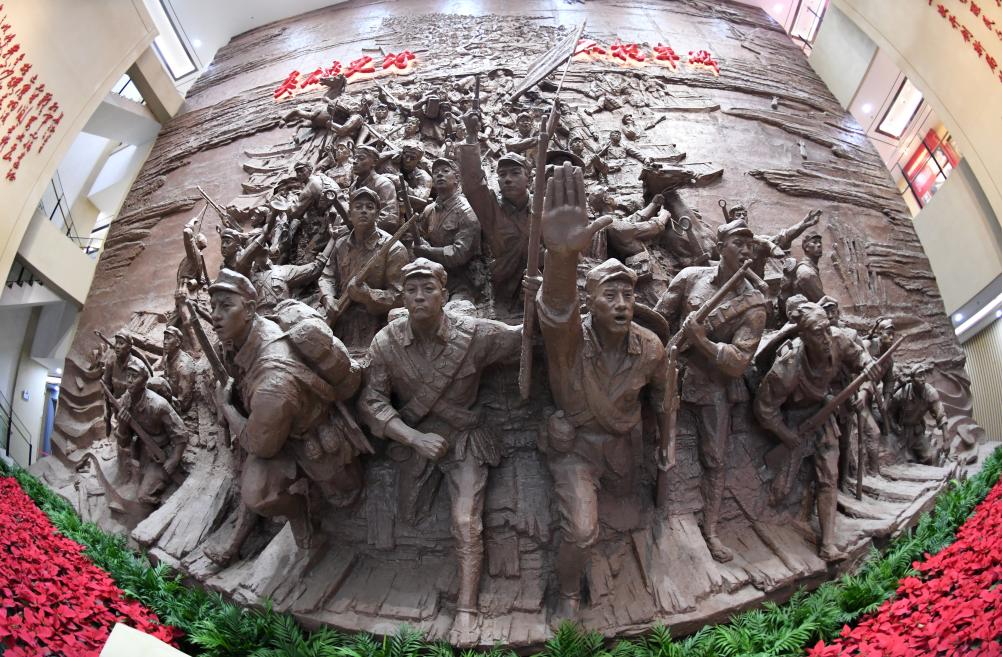 这是全州县红军长征湘江战役纪念馆内的雕塑(2021年4月26日摄)。