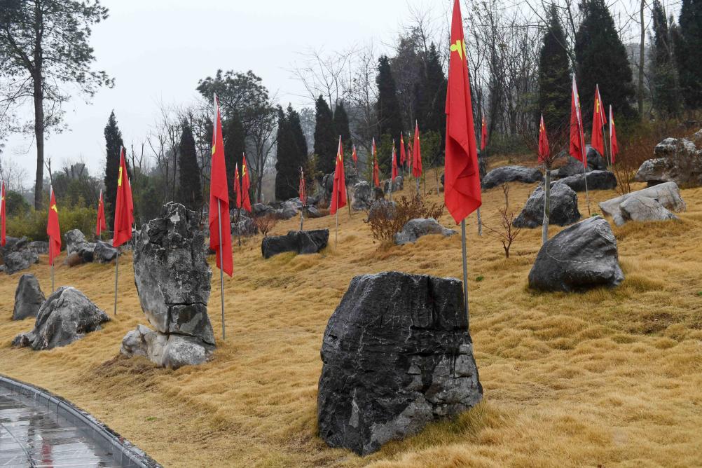 在全州红军长征湘江战役纪念园,散布着形状各异的巨石,石块下安葬着烈士遗骸(2021年2月3日摄)。