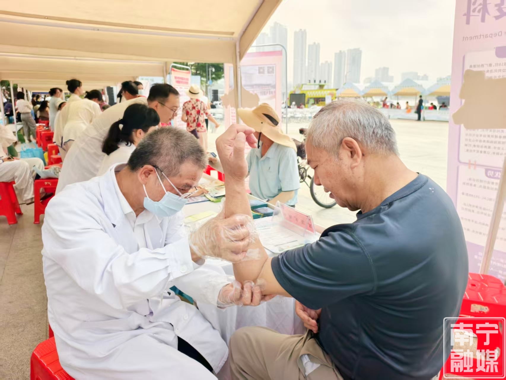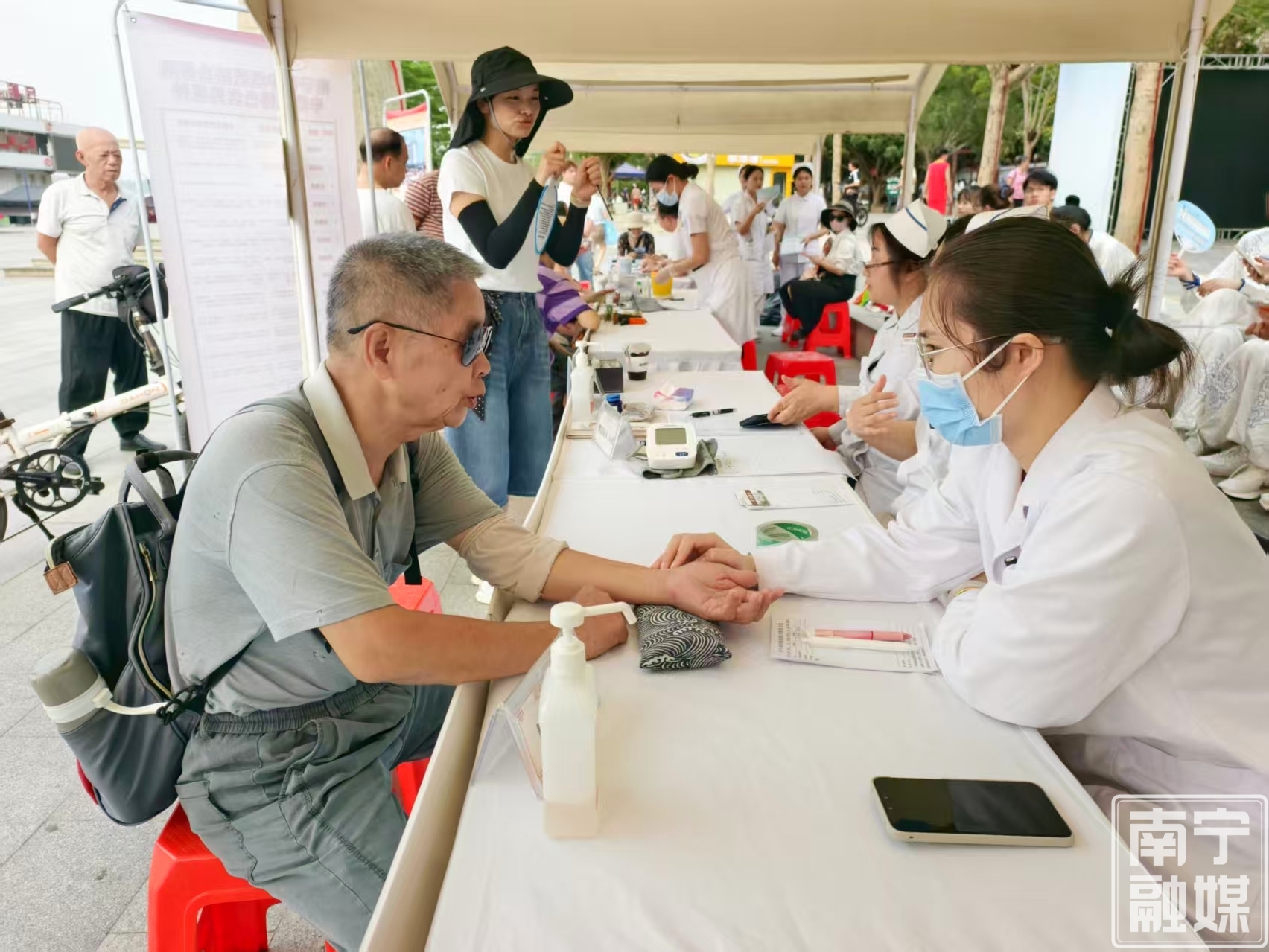人气火爆的“健康集市”成为市民“打卡”处。在健康义诊区,南宁市第一人民医院科普健康体重和肿瘤预防知识,南宁市第七人民医院提供中医非遗技术体验,南宁市中医医院专家现场把脉问诊,南宁市口腔医院医生讲解口腔保健要点,南宁市第二妇幼保健院的颊针体验吸引不少市民驻足,南宁中心血站的无偿献血地面飞行棋游戏人气高涨,南宁市疾控中心发放健康宣传资料,西乡塘区卫健局工作人员为市民测量血压血糖……十几家单位各展所长,让健康知识变得“看得见、摸得着”。