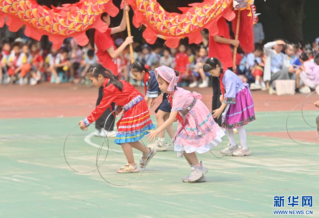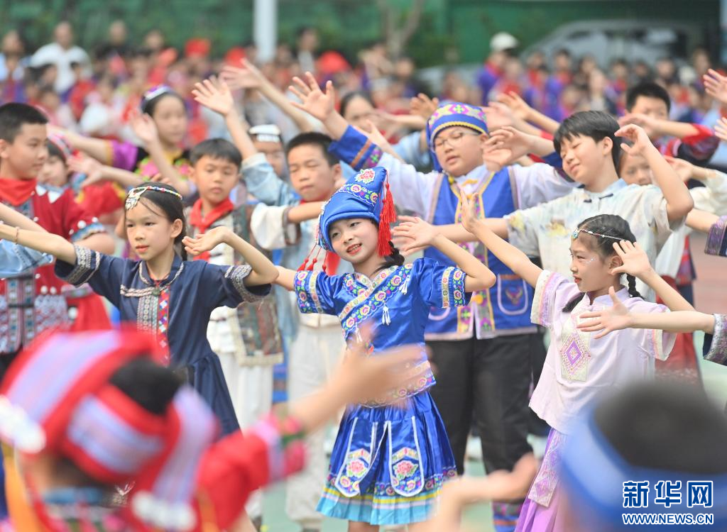 4月16日,在梧州市龙圩中心小学集团举行的“三月三”民族团结主题实践活动中,小学生们在跳篝火舞。