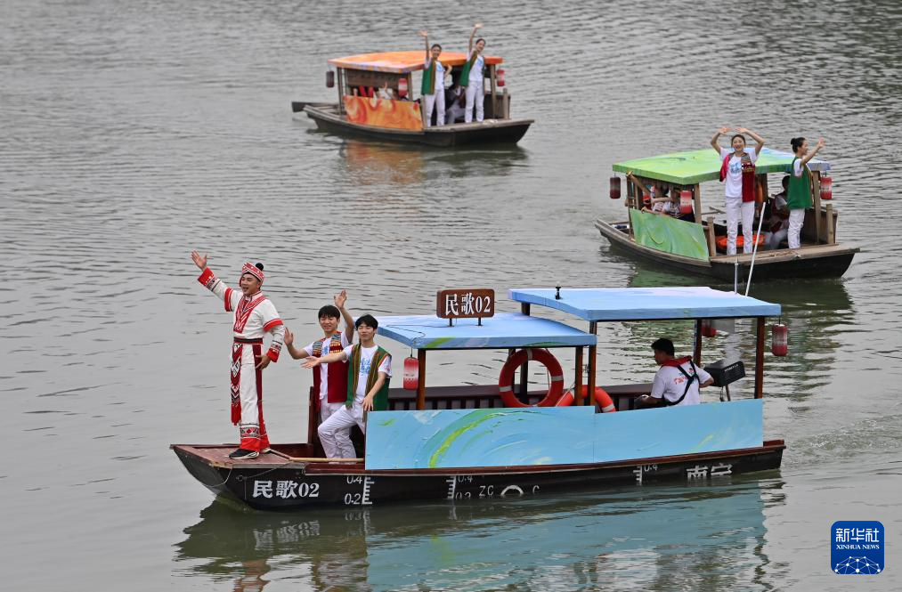 4月19日,2026年“广西三月三·八桂嘉年华”文化旅游品牌活动继续在南宁市民歌湖举行,演员乘坐游船在湖上表演。