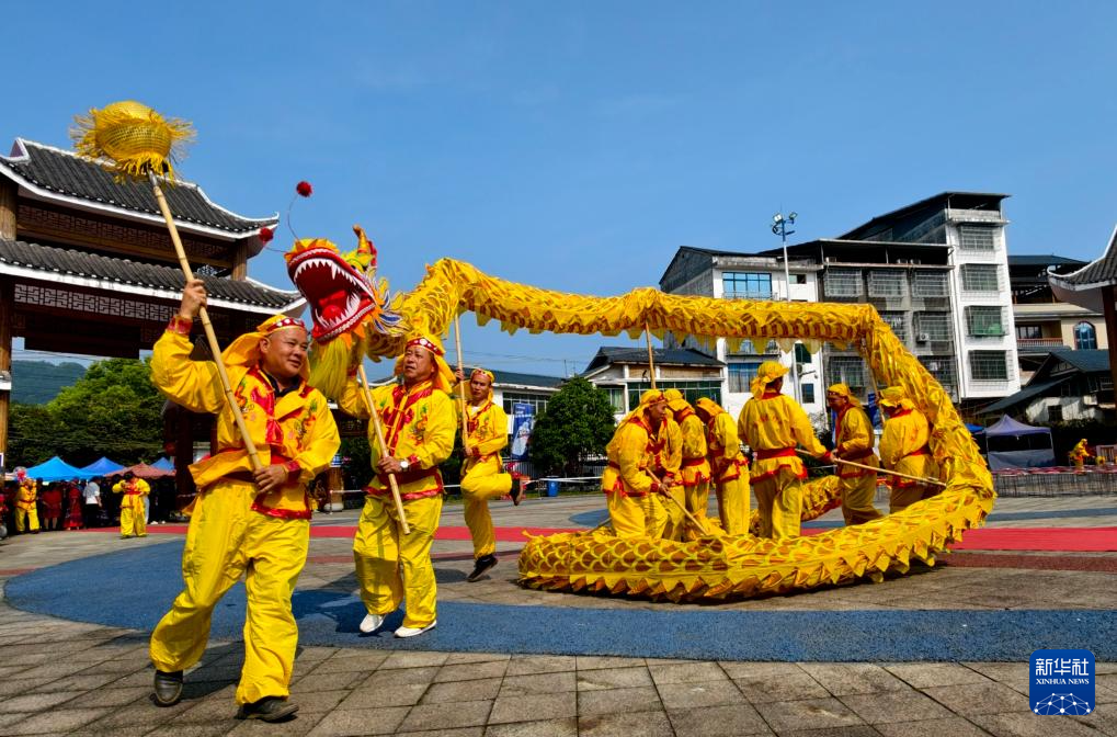 4月19日,在广西柳州市融安县板榄镇欢歌广场举行的“三月三”活动上,民间艺人表演舞龙。