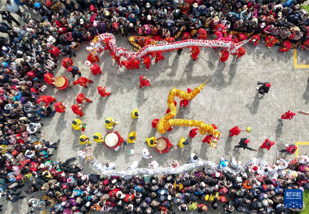 4月19日,村民在江苏省泰州市海陵区唐甸村“三月三”传统庙会上进行舞龙表演(无人机照片)。