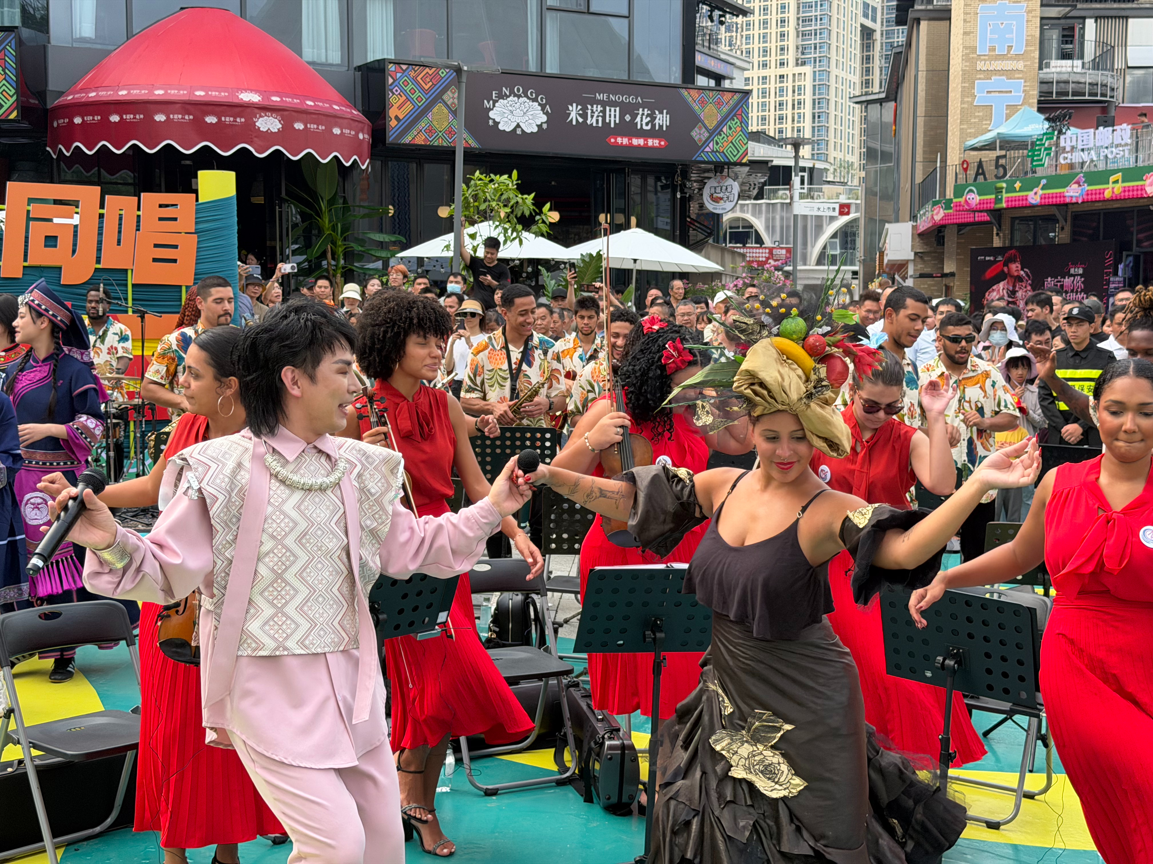“唱山歌来……”一声清亮的唱腔从舞台响起,悠扬的旋律随之铺展开来。巴西乐手循着节拍起舞,中国年轻人也纷纷加入。很快,人们迅速聚拢,围成圆圈,踏着节奏即兴舞动。