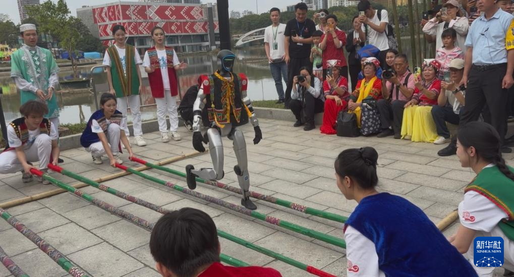 在南宁市的“广西三月三”活动现场,机器人竹竿舞表演吸引游客驻足观看。新华社记者黄凯莹 摄