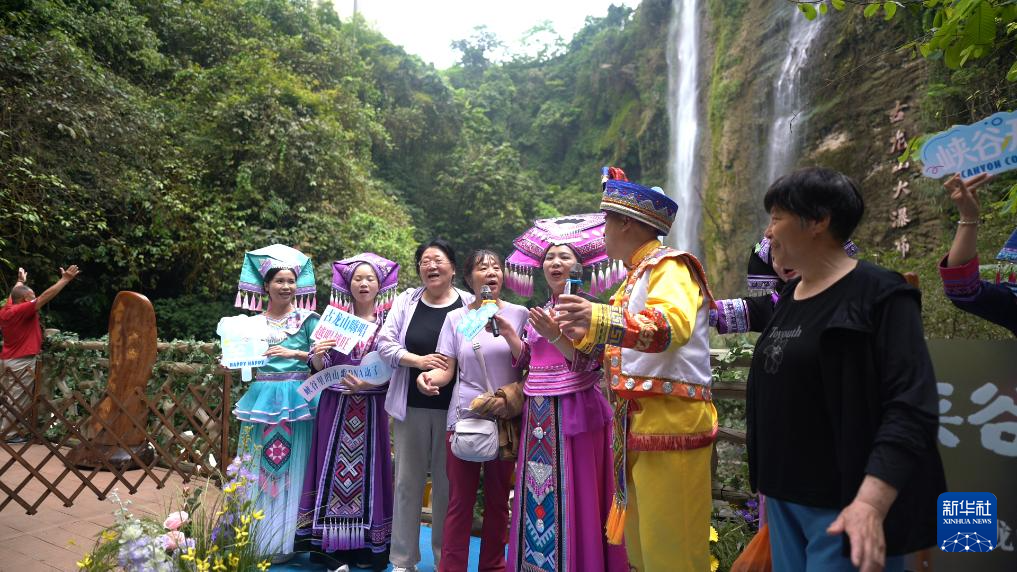 在古龙山大峡谷景区里,游客与身着民族节日盛装的工作人员一同唱山歌。(受访者供图)