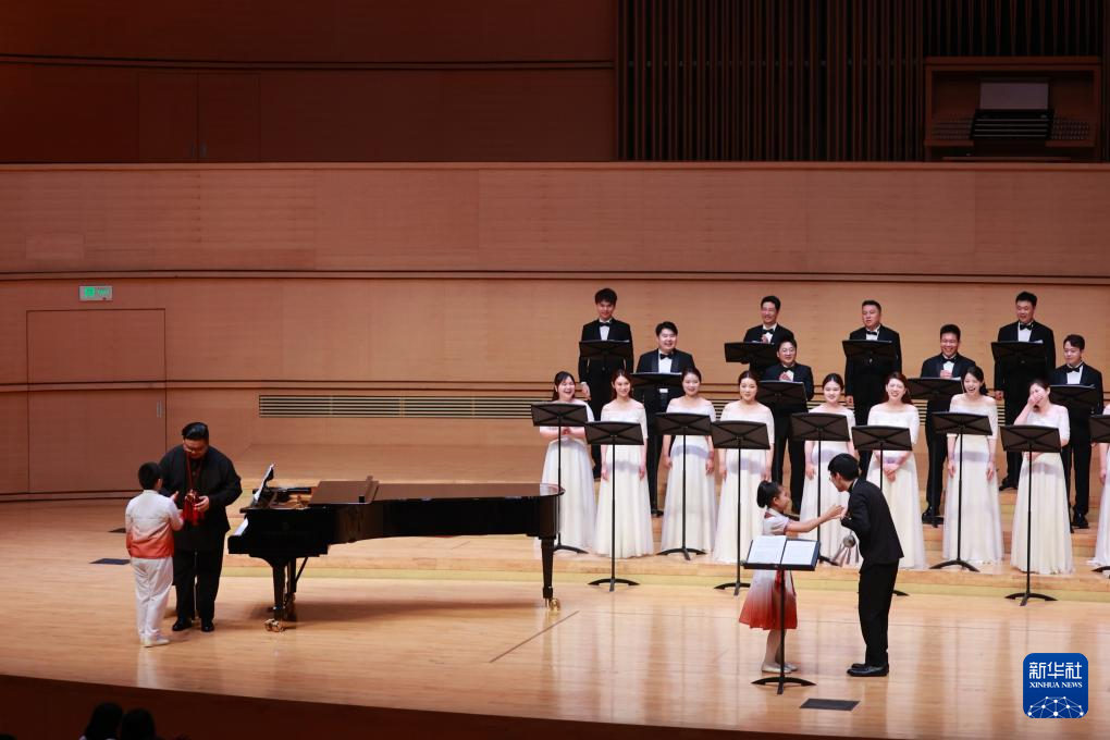 在广西文化艺术中心的一场“三月三”主题演出中,小演员向合唱团成员送上绣球。新华社记者黄凯莹 摄