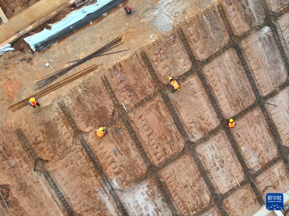 4月21日,中铁二十局的工人在来宾市兴宾区寺山镇柳覃高速公路建设工地作业(无人机照片)。