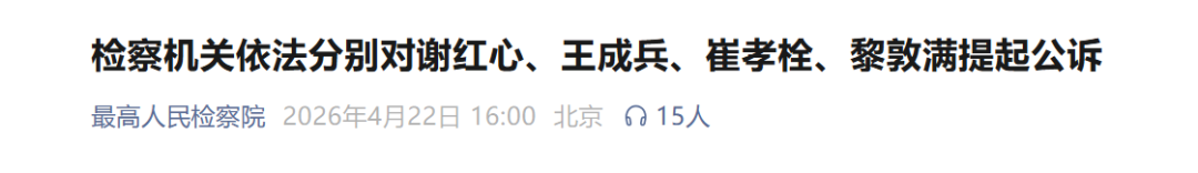 据最高人民检察院4月22日消息,日前,广西投资集团有限公司原党委委员、副总经理黎敦满涉嫌受贿罪一案,由广西壮族自治区监察委员会调查终结,移送检察机关审查起诉。经广西壮族自治区人民检察院指定管辖,由贺州市人民检察院依法向贺州市中级人民法院提起公诉。案件正在进一步办理中。