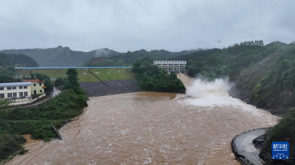 4月21日,广西柳州市融安县泗维河水库开闸泄洪(无人机照片)。