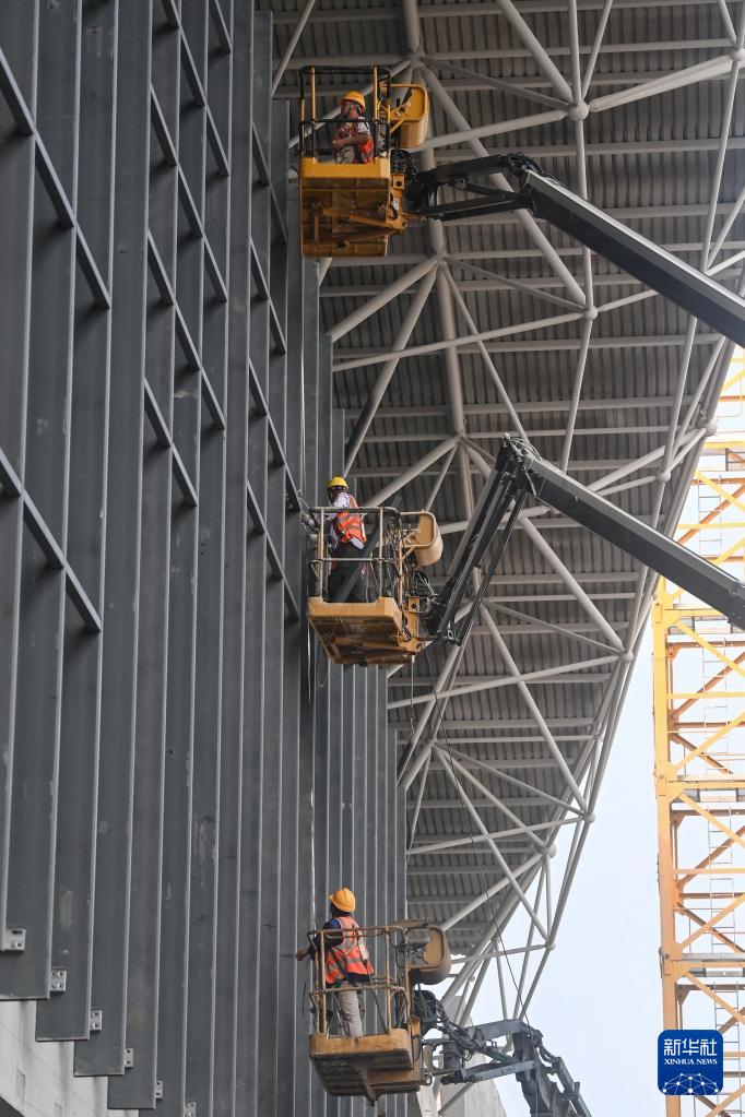 中铁十一局的施工队工人在容县南站开展装潢作业(3月27日摄)。