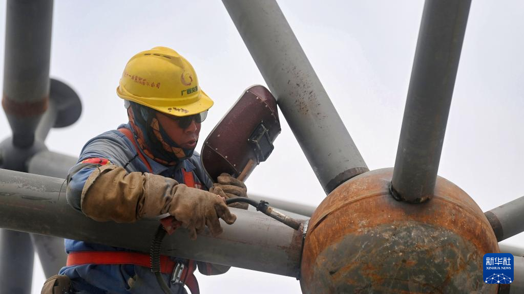 中铁十一局的施工队工人在焊接容县南站的屋顶钢结构(3月27日摄)。