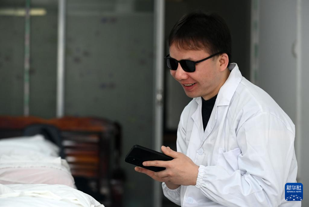 蓝宁在南宁市一家盲人按摩店工作之余借助手机构思写作。新华社发