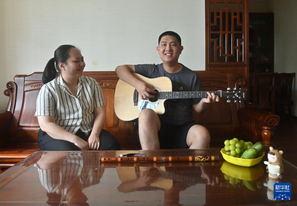 李莹(左)在家中听爱人弹唱乐曲。新华社记者 陆波岸 摄