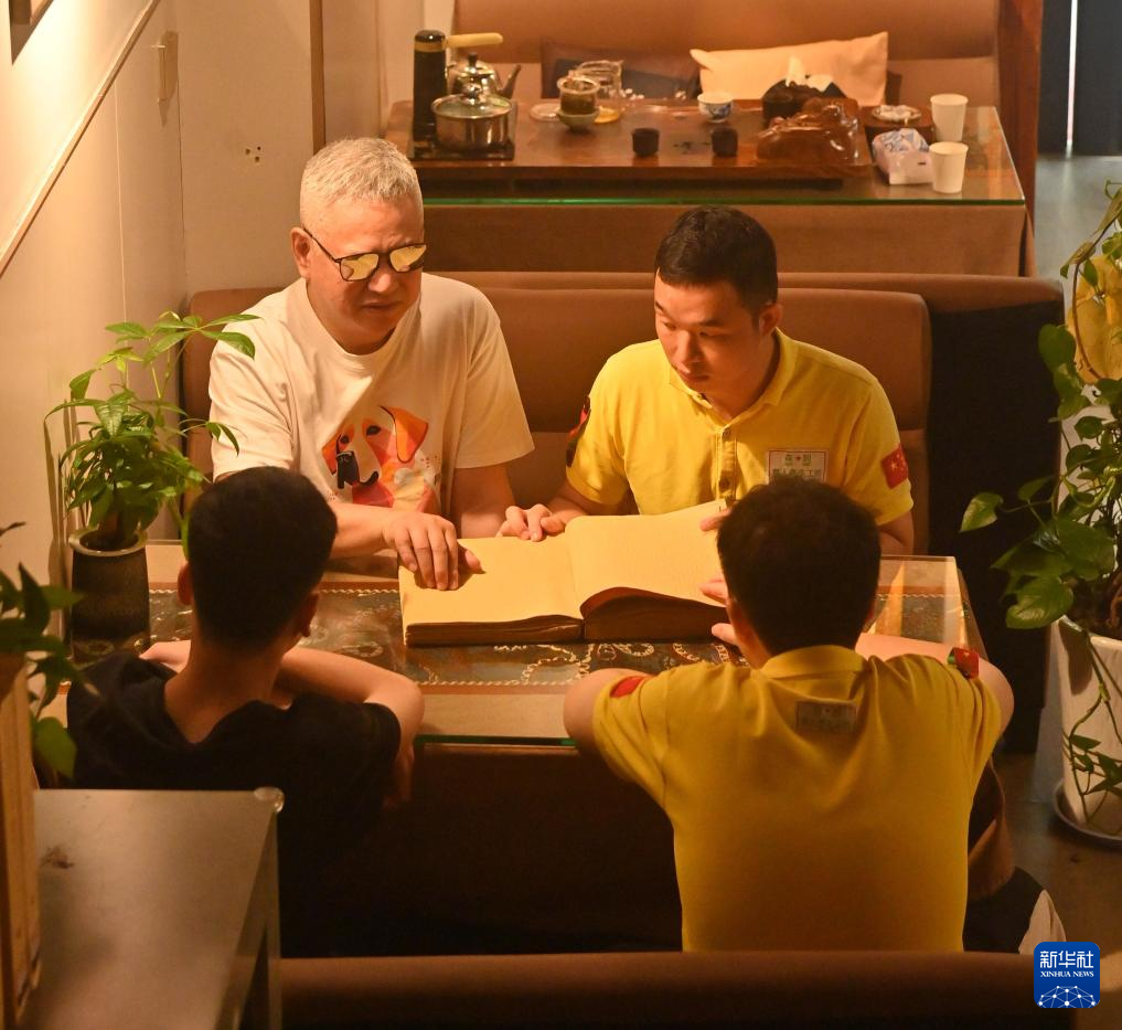 视障人士在南宁市明秀东路盲人读书角探讨盲文学习方法。新华社记者 陆波岸 摄