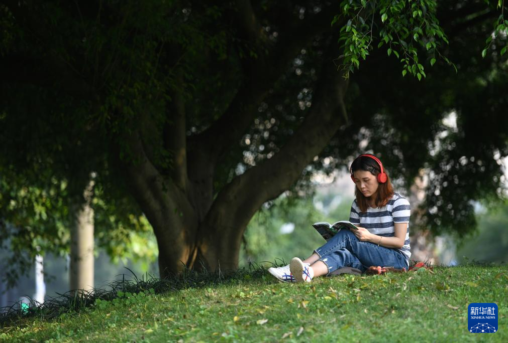 一名市民在广西南宁市南湖边读书。新华社记者 陆波岸 摄