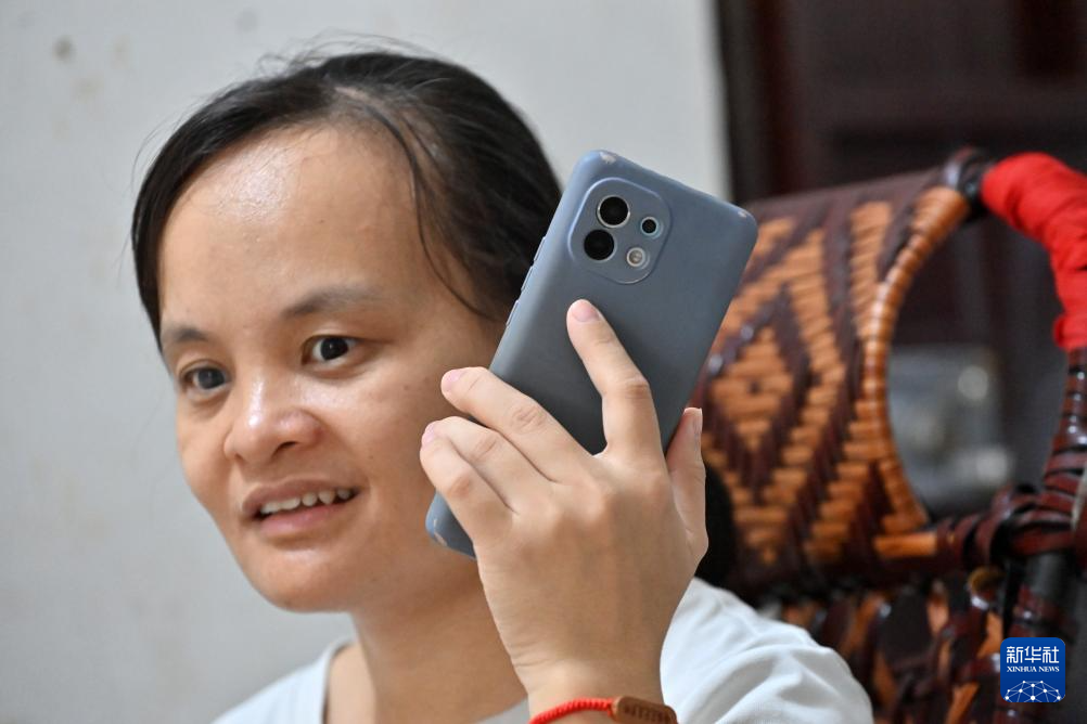 蓝野针在广西凤山县凤城镇廉租住房里用手机听文学作品朗读。新华社记者 陆波岸 摄