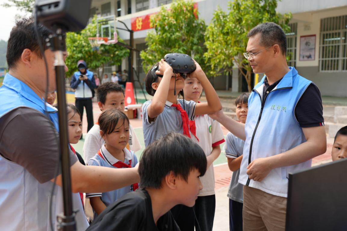 科技赋能+沉浸体验,科普形式再升级。除了课堂内容,活动现场还有VR实景漫游,学生们通过虚拟设备沉浸式游览自然风光,并了解VR技术在边境资源普查、生态监测中的实际应用。科普人员指导边境学生体验VR实景漫游系统矿物标本展,学生们在互动中加深了对家乡资源的认知。