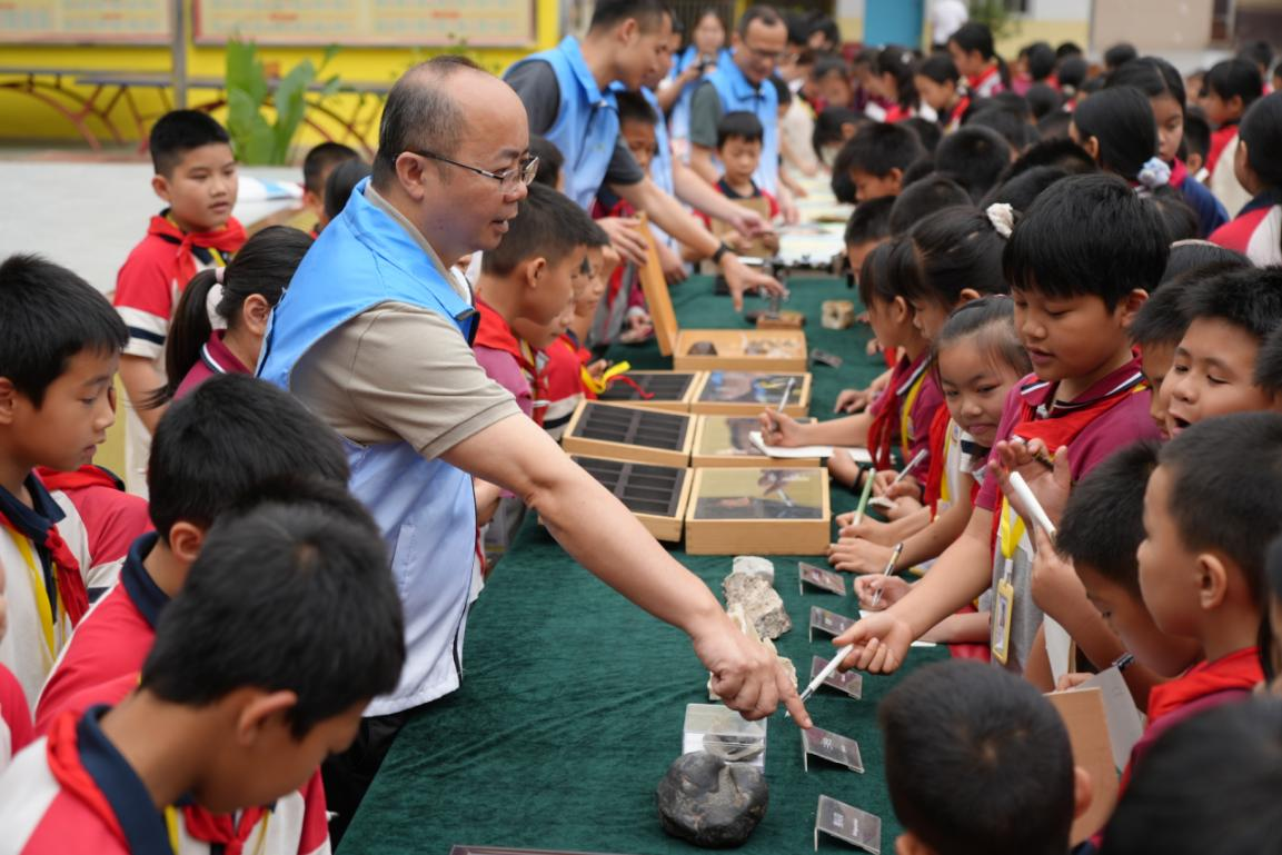 活动第一站走进宁明县爱店镇中心小学,广西自然资源档案博物馆带来“霞客寻桂・宁明岩溶科普课堂”,科普队员在展示区向边境学子讲解矿物岩石标本。展台上,宁明特色膨润土矿石、岩溶岩石标本、古生物化石一字排开,学生们围聚观摩、踊跃提问。科普人员结合实物,深入浅出地讲解当地矿产资源禀赋、喀斯特地貌成因,以及徐霞客对广西岩溶地貌的科学考察贡献。随后的模拟钟乳石形成趣味实验,更是让学生们直观感受到地质演化的神奇。