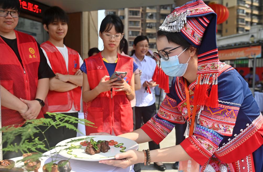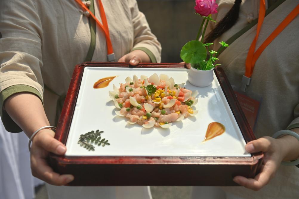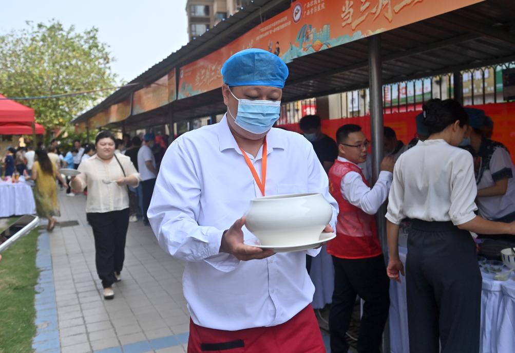 4月24日,在南宁市广西骨伤医院长虹社区卫生服务中心,参赛人员端着中医药膳美食前去给评委评分。